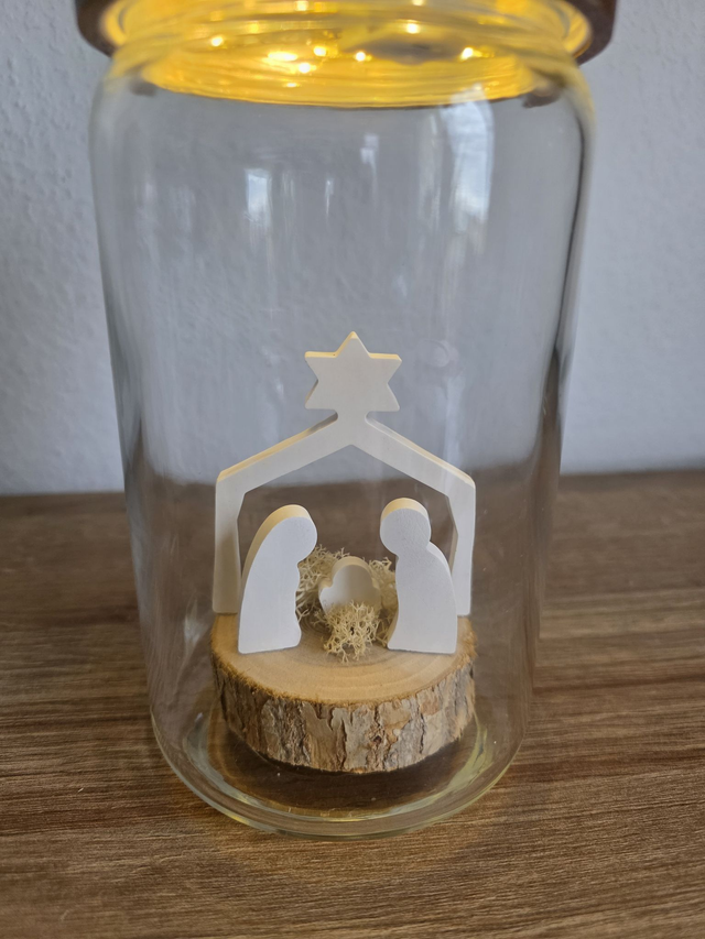 Eine kleine Krippe im Glas die von oben beleuchtet wird. Das Glas hat einen Höhe von 19 cm und einen Durchmesser von 10 cm.